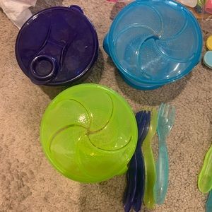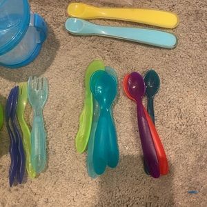 Gently used. Container for powered formula, two containers for snacks, utensils, and stay put placemats.