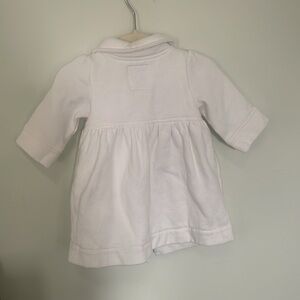 White baby jacket in an open pea coat style. So cute we just never used it after it was given to us!