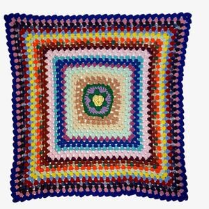 Colorful Baby Blanket or lap throw that's been Hand Knit or Crocheted in a colorful array of yarn with a flower in the middle. Good pre-owned condition.