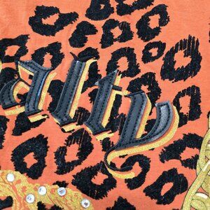 Baby phat 90s y2k Orange Graphic Tee Shirt With Leopard Print & Chain Detail L