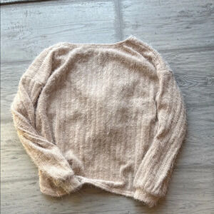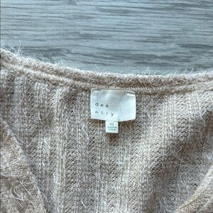 This tan V-neck sweater boasts a soft, knitted texture that complements its relaxed fit. The standout twist detail at the center front adds a unique touch, making it perfect for casual outings.