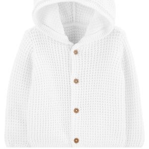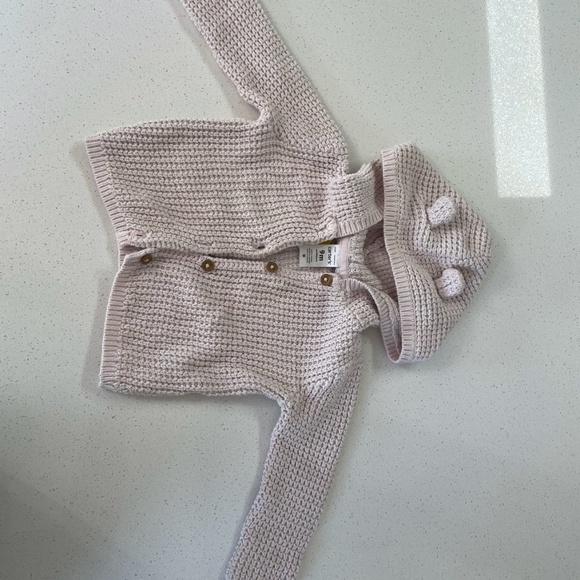 This adorable knitted baby sweater from Carters is 100% organic. The color is almost a beige / really light pink color.