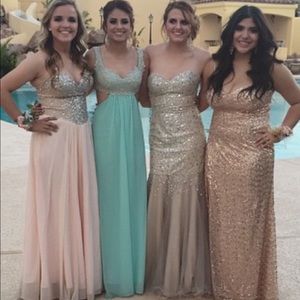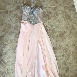 100% polyester. Hand beaded. Worn once, a little dirty on the bottom but otherwise in great condition. Lace up corset type back and a slit in the leg.