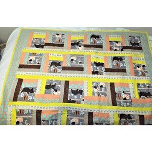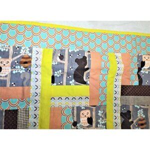 Panels with honey bears, bees, squirrels and owls on a peach, yellow, gray and aqua quilt. Reverses to peach polka-dots. Quilt is 50 inches by 40 inches.