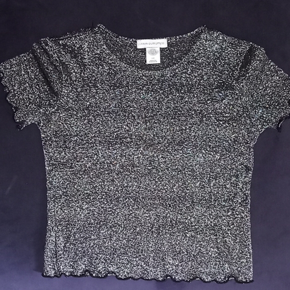 Fitted, black and silver sparkle baby tee with lettuce edge sleeves. First pic is with the flash on