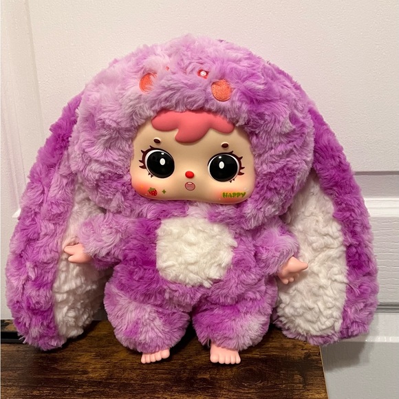 Adorable plush doll in a purple bunny costume. Features pink and white accents.