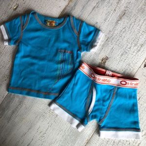Bright blue 2 piece set with colorful contrast stitching. So adorable! Great for just hanging out on those warmer days! Soft all cotton fabric.