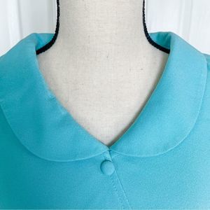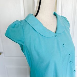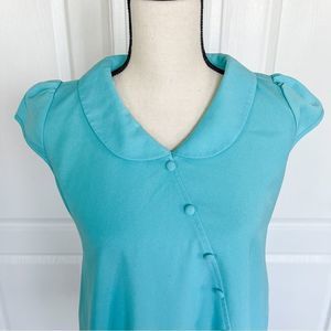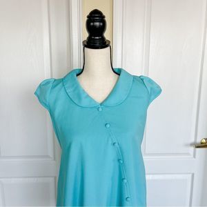 This lovely maternity dress comes in a baby blue color that is bright and cheerful. The fabric is a light weight and the cut is loosely fitting with a cute belt to tie the look together. There is no size tag, but it fits like a size 2 and has plenty of room for your baby belly!