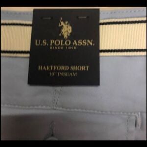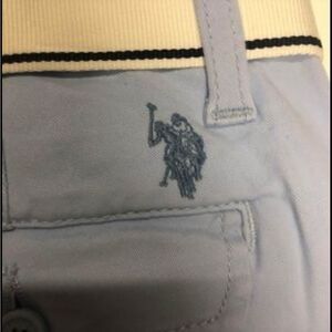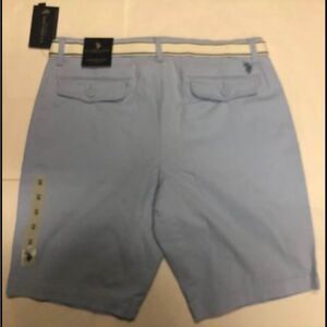 This is brand new with tags never used or worn. Comes with a free belt. 10 inch inseam. Zip fly. The fabric content is 98% cotton, 2% spandex. The color is light blue.