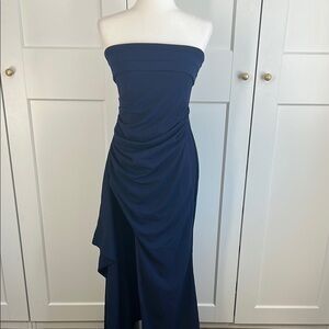 Step into elegance with this stunning navy strapless evening gown. Perfect for any formal occasion, this dress features a sleek design and a daring side slit. Elevate your style effortlessly.