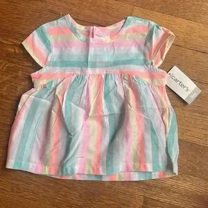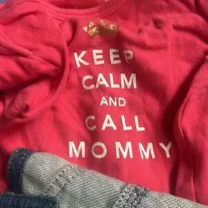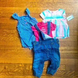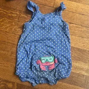 4. Onesie periwinkle with white polkadots. Two hot pink bows in front crab on the back side for the booty. See pictures. This one is worn but still in decent shape!