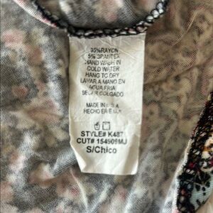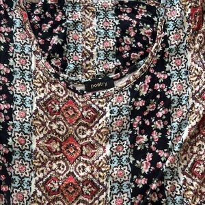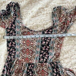 Stylish Bohemian look babydoll dress with a floral pattern. Features a mix of rust, black,turquoise green and cream colors. Perfect for casual outings.
