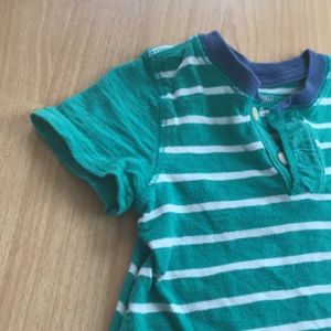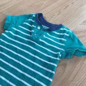 This green, white and blue onesie has short sleeves and shorts. It is a boys size 18-24 months and has three buttons at the top. This outfit will keep your little one cool during the warmer months.