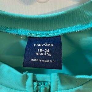 BabyGap Rashguard with a full front zipper for easy on and off. Beautiful turquoise blue and in excellent condition. I would say this tan small, more like 8-16 months.