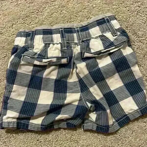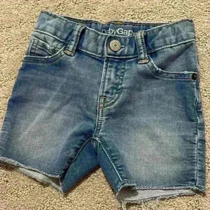 two pairs of shorts 1. cut off jean shirts with adjustable waist 2. pull on blue and white shorts