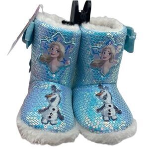 Toddler girl faux shearling boots; • Silver and blue sequin upper; • White faux fur along the collar and bottom; • Character art on the vamp and shaft; • Large snowflake applique; • Blue bow on the shaft; • Durable TPR and fabric bottom with texture for slip resistance.