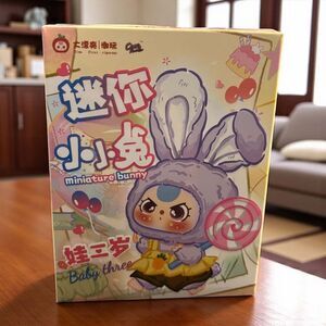 This listing features a Baby Three Macaron Cute Bunny Vinyl Plush Blind Box, specifically the mint green variant. This collectible figure comes with soft, fluffy green bunny ears and a matching top, paired with denim-style overalls. The figure can be attached to a keychain, as shown in the images. This item is part of the 'Miniature Bunny' series from Cureplaneta. It is new in its original packaging, perfect for collectors of blind box figures and cute plush characters. Please note that the figure has a unique hair color and expression, as part of the random assortment of the blind box series.