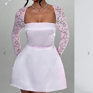 Ultra feminine and alluring, the Sadie mini in Blush is made for romantic dinner dates, garden parties and so much more. Cut from our premium satin fabric, the body of the dress features a square neckline and ultra cinched waist for the silhouette of dreams, contrasted by a voluminous bubble skirt. The look is complete with sheer lace sleeves with flared cuffs.