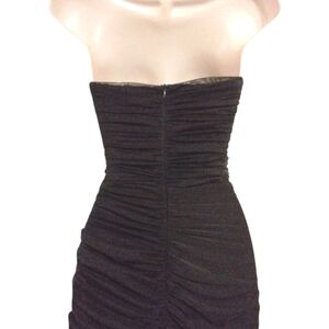 This chic strapless dress in classic black is designed to make a statement at any event. Its sleek silhouette and timeless color exude sophistication and elegance. Perfect for those who want to stand out with effortless style.