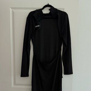Open Back, with a high Neck line and button details, open leg slit on the right side, bodycon black dress.