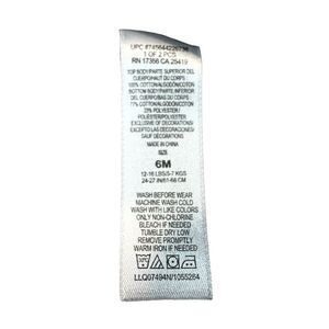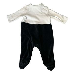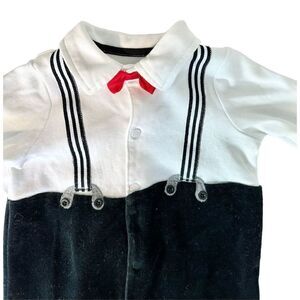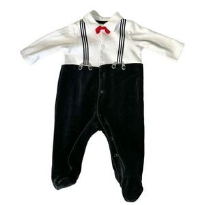 Baby’s Little Me brand “formal wear.” A one-piece suit in black velour bottoms and white jersey top with red bow tie. Cotton-polyester blend. Pretty adorable. Says two pieces but this is only a one-piece suit. Size 6 months.