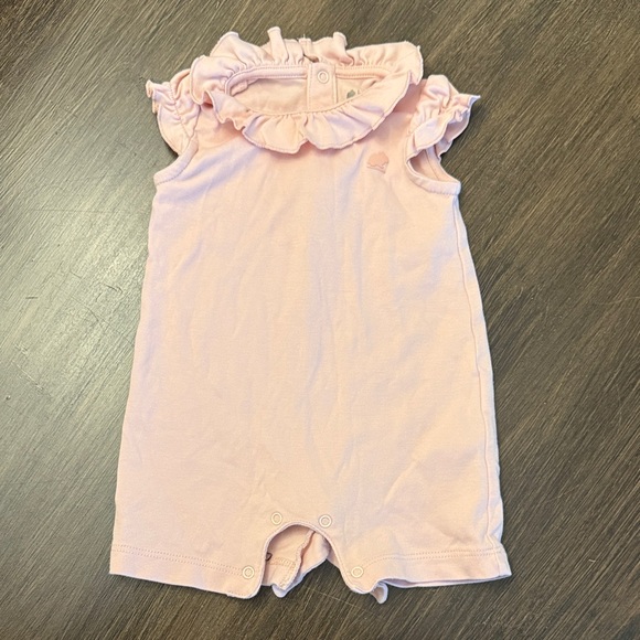 Charming romper with ruffled sleeves and collar. Soft pink fabric for a gentle touch.