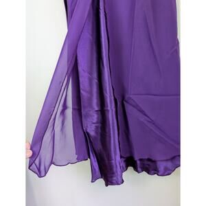 -Features: Gorgeous royal purple satin with a sheer split overlay. There is a 3" sheer lace inset at the waist. The plunging V-neck is trimmed with sheer ruffles. The hems are serged, creating a flowy, ruffled effect. Adjustable spaghetti straps.