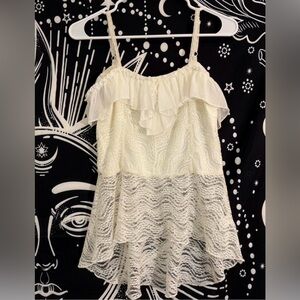 This elegant lace ruffle top in cream is perfect for any occasion. Its delicate design adds a touch of sophistication to your wardrobe.