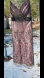 Pink satin with black mesh overlay with sparkly swirly floral pattern. Black satin waist with tie in back. Zipper in back.