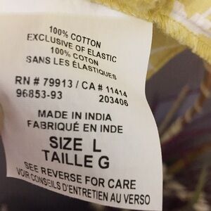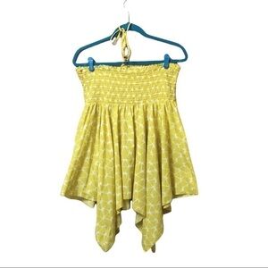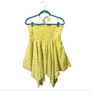 Motherhood maternity babydoll elastic bandeau chest and single halter tie with single wood bead detail summer top. Handkerchief asymmetric hem 100% cotton, light and cool for summer! Colors are more a gold than yellow with white in a geometric diamond print. Size large good preowned condition.