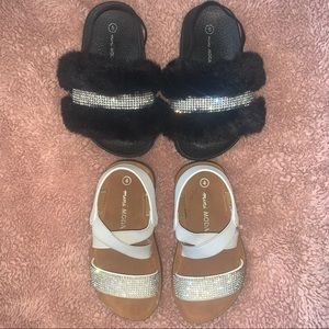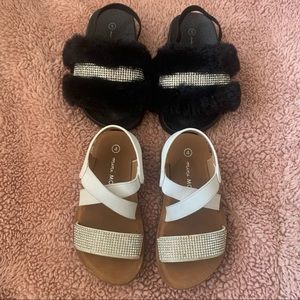 almost like new !each worn only once or twice ! BLACK FURRY SLIDES: size 5 WHITE GLITTER SANDLES: size 4
