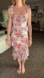 Measures 17 inches pit to pit and 42 inches shoulder to hem. This dress has so so much detail it looks like a faux wrap with bows on shoulders and two more on the waist line of dress with rhinestone brooch in center this has a dangling metal Babylon with diamond chip hanging neat hip on left side. There are tons of ruffles. The one bow on left side is missing the stitch to attach it down on one side as shown in photo. Otherwise in like new condition