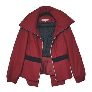 Winter Coat, Quilted interior, Dark Red Outer, Detachable Huge Bow, Full Zip in golden tone, Pop Shoulders, Ruched cuffs, High Neck