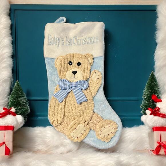 Make your baby's first Christmas unforgettable with this adorable Baby's 1st Christmas Stocking! Featuring a charming blue teddy bear design, this stocking is crafted with soft plush fabric and accented with classic corduroy and gingham details, adding a touch of timeless charm. Made by St. Nick's Choice. 100% Polyester