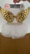 Tutu is layers of white tulle; the top layer has gold dots. The wings are shiny gold. Both have a gold and white elastic band.