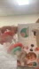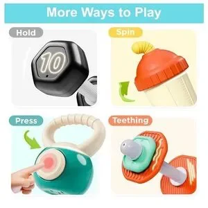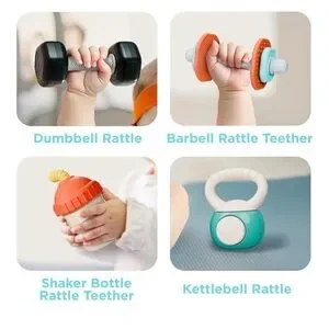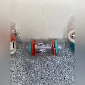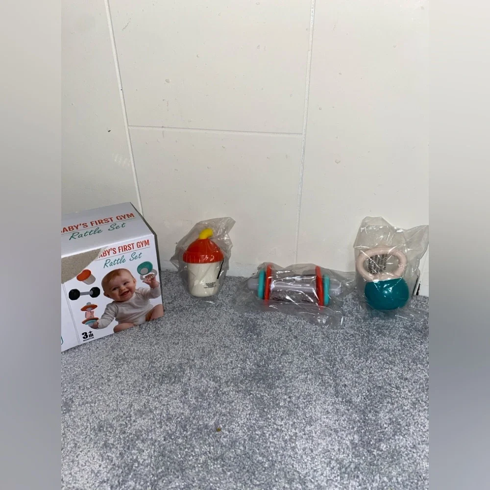 Set of three baby rattles in original packaging. Includes cream and red cup-shaped rattle, clear-bar rattle with teal and orange ends, and teal ring rattle with pink handle. Bright, playful colors. Safe infant toy set.