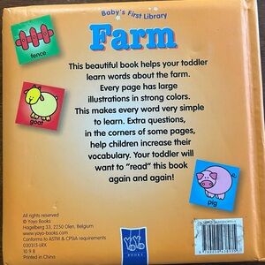 Introduce your child to farm life with the Baby's First Library Farm Book. Featuring vibrant colors and engaging illustrations, this book is perfect for early learning.