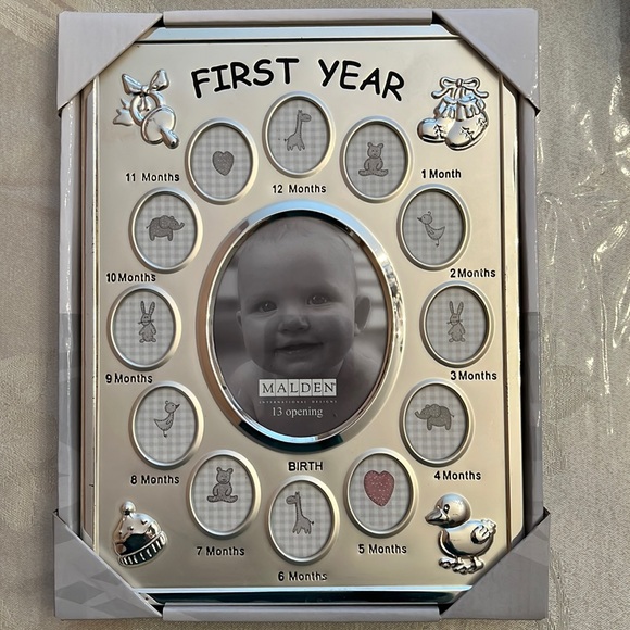 Holds 12 small photos (one for each month) and (1) 3” x 4” birth photo in the center.