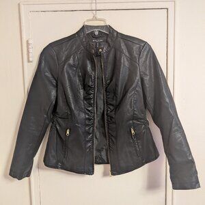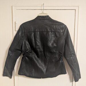 This is a beautiful black faux leather jacket from Baccini in Medium. It has two zippered pockets and is designed to give an hourglass figure with the ruched panels on the side and middle. EUC (Excellent Used Condition).