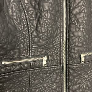 Vegan leather - The lining material is polyester. New with tags. Pair with your favorite jeans + tee for an instant rocker edge, or layer over dresses to add structure. The petite medium size offers a flattering fit without being too cropped. The detailing gives it visual interest while staying wearable. Vegan leather black moto biker jacket - rock chic, street style, edgy fashion, layering.