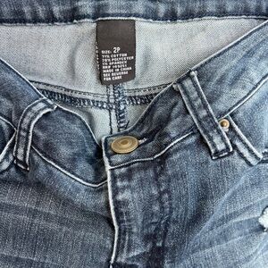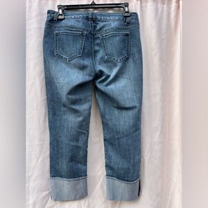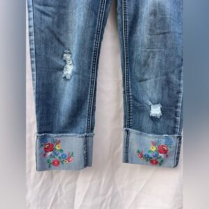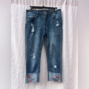 Trendy blue cropped jeans with floral details. Distressed style for a modern look. Perfect for casual outings.