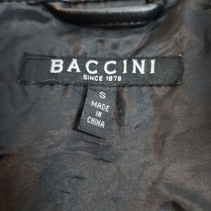 The Baccini Fux Leather Motorcycle Jacket in size Small is a stylish and versatile outerwear option for women. Made from faux leather with a polyester lining, this mid-length jacket features a zip closure and long sleeves, making it perfect for travel and casual occasions during the winter, fall, and spring seasons. The classic black color and biker-themed accents add a touch of edgy sophistication, while the hand wash only care instructions ensure easy maintenance. With a solid pattern and a timeless motorcycle style, this jacket is a must-have for those looking to make a statement.
