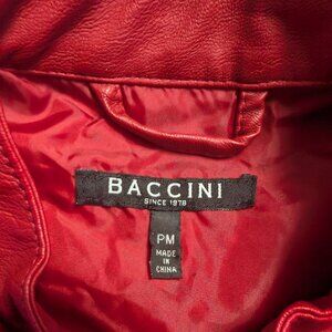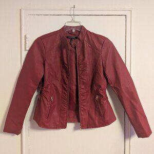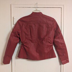 This is a beautiful red faux leather jacket from Baccini in Petite Medium. It has two zippered pockets and is designed to give an hourglass figure with the ruched panels on the side and middle. EUC (Excellent Used Condition).
