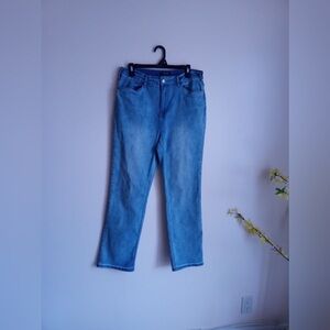 Baccini Women Flair 12 Washed Distressed Jeans #149251 70% cotton 26% polyester Baccini brand jeans in a light blue wash, size 12. These are straight-leg jeans, as indicated by the consistent width of the leg from the thigh down to the ankle. The jeans are laid flat on a wooden surface. Based on available listings, Baccini jeans in size 12 can be found in various styles, including boot cut, embellished designs, and capri styles.