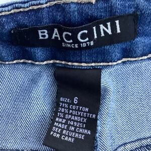 Keywords: Baccini, skinny jeans, floral embroidery, blue jeans, women's denim, medium wash, mid-rise, casual wear, stretchy jeans, pre-owned jeans, machine washable, regular fit, button closure, cotton blend, versatile jeans.