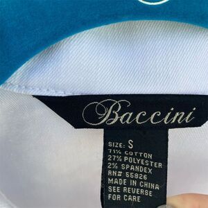 The Baccini women's vest in size S features a basic jacket style with a sleeveless design. Made from 71% cotton, 27% polyester, and 2% spandex, it has a button-down front, classic collar, and intricate shoulder stitching. The vest is white and was manufactured in China. For garment care, please see the care label. MPN: RN# 55826. Condition: Pre-owned.