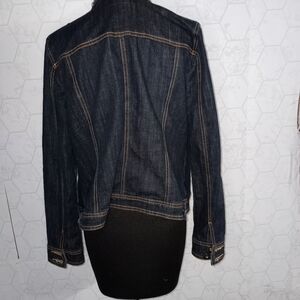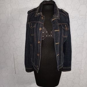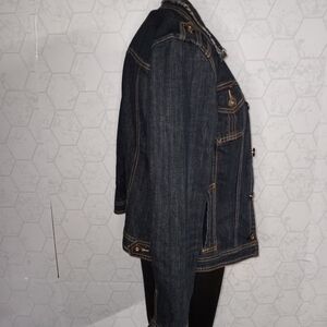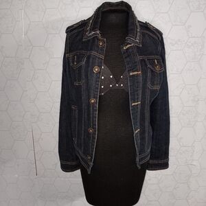 Baccini distressed overlapping collar blue button up denim jacket this jean jacket does have some weight to it
