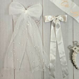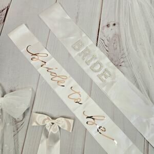 -2 Sashes (both white satin, one has "BRIDE" text in pearl & rhinestone bedazzled felt lettering, the other has "bride to be" script in metallic rose gold