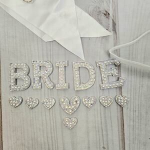 -1 set of peal / rhinestone bedazzled felt letters and hearts that can be glued onto something such as a hat, tshirt, etc