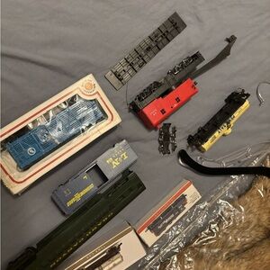 A vintage Bachmann HO scale train set featuring a Penn Salt locomotive and a tank car replica of the Great Northern. The train is made of wood and manufactured in 1990, with a two-rail analog control system. It is part of the Cars franchise and designed in a multicolor scheme for the Union Pacific Railroad, with a theme of transportation.